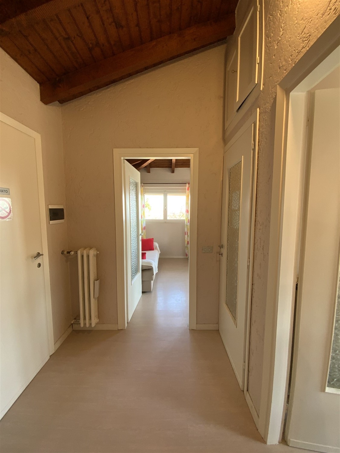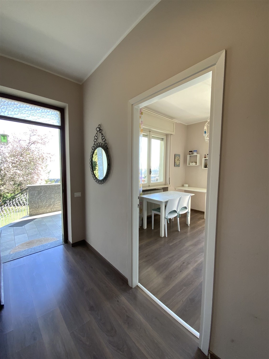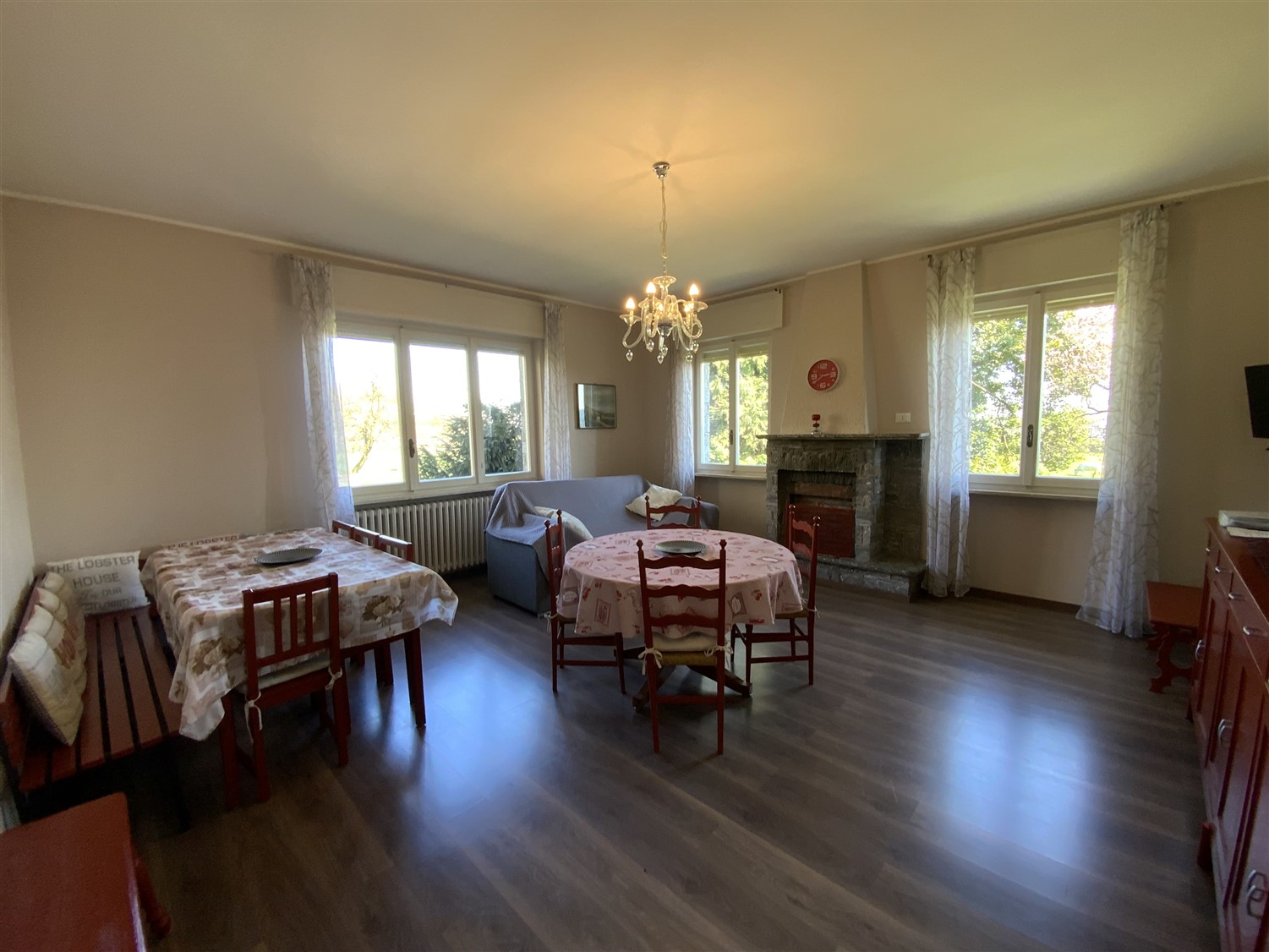 The house is arranged as follows: a comfortable staircase invites you to a porch and the entrance into a hallway that divides the areas, large living room with fireplace, eat-in kitchen with access to the terrace, two large double bedrooms both with access to their own balconies and a bathroom, stairs leading to the basement rooms where there are various utility rooms and the garage. On the first floor there is a lovely two-room apartment, living room with kitchenette, panoramic view of Lake Maggiore, with the Rocca di Angera in the background, a comfortable double bedroom and a bathroom; there is the possibility of joining the two apartments.