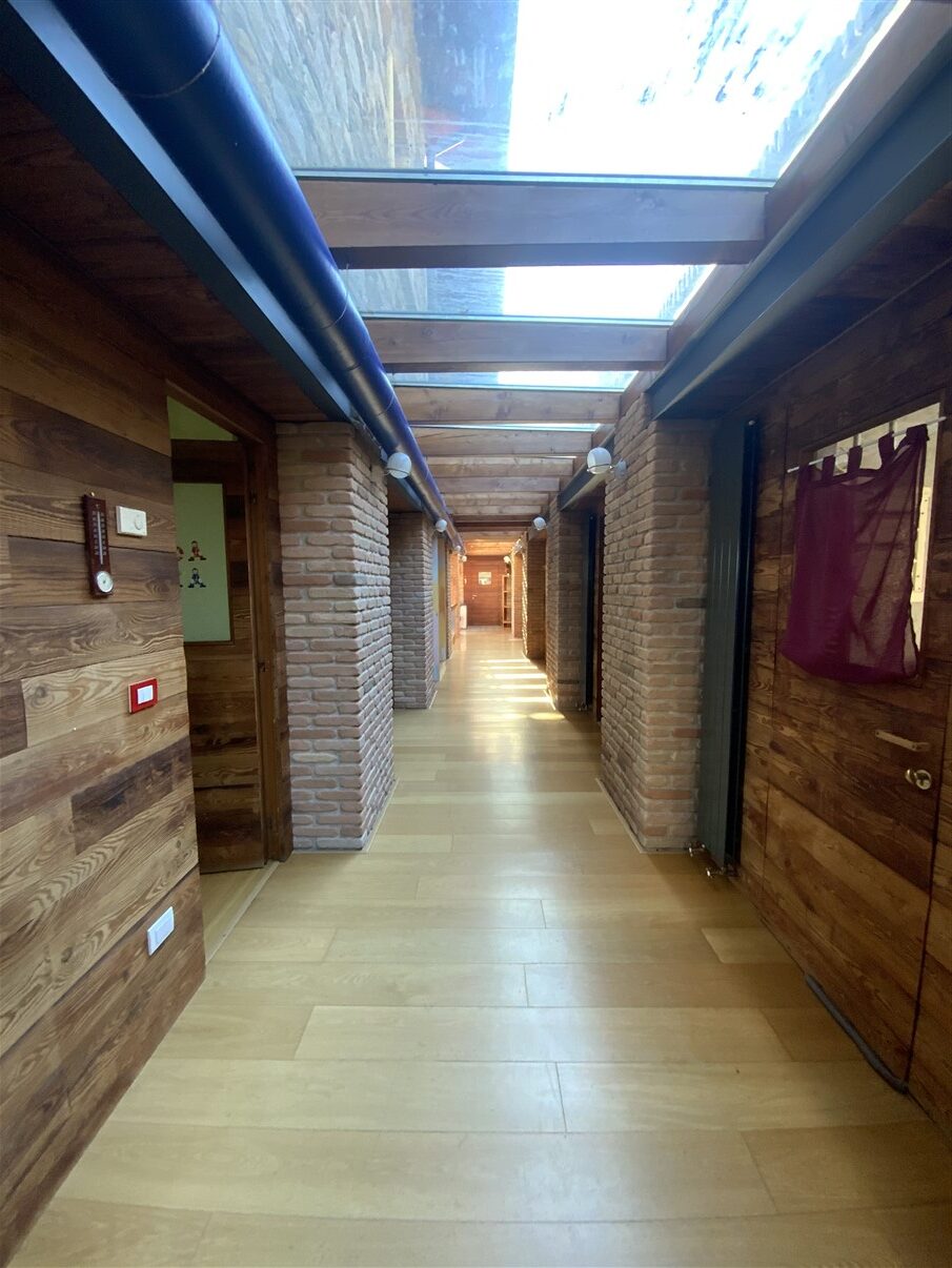 Il casale è così disposto: dall’ingresso si procede tramite un lungo corridoio dove si aprono le camere al piano terra, la matrimoniale con bagno en suite, due camere doppie con relativi bagni, alla fine del corridoio si apre una grande cucina pranzo con accesso diretto al giardino e con vista panoramica, a servizio della zona giorno troviamo grande dispensa attrezzata, lavanderia stireria e bagno ospiti.