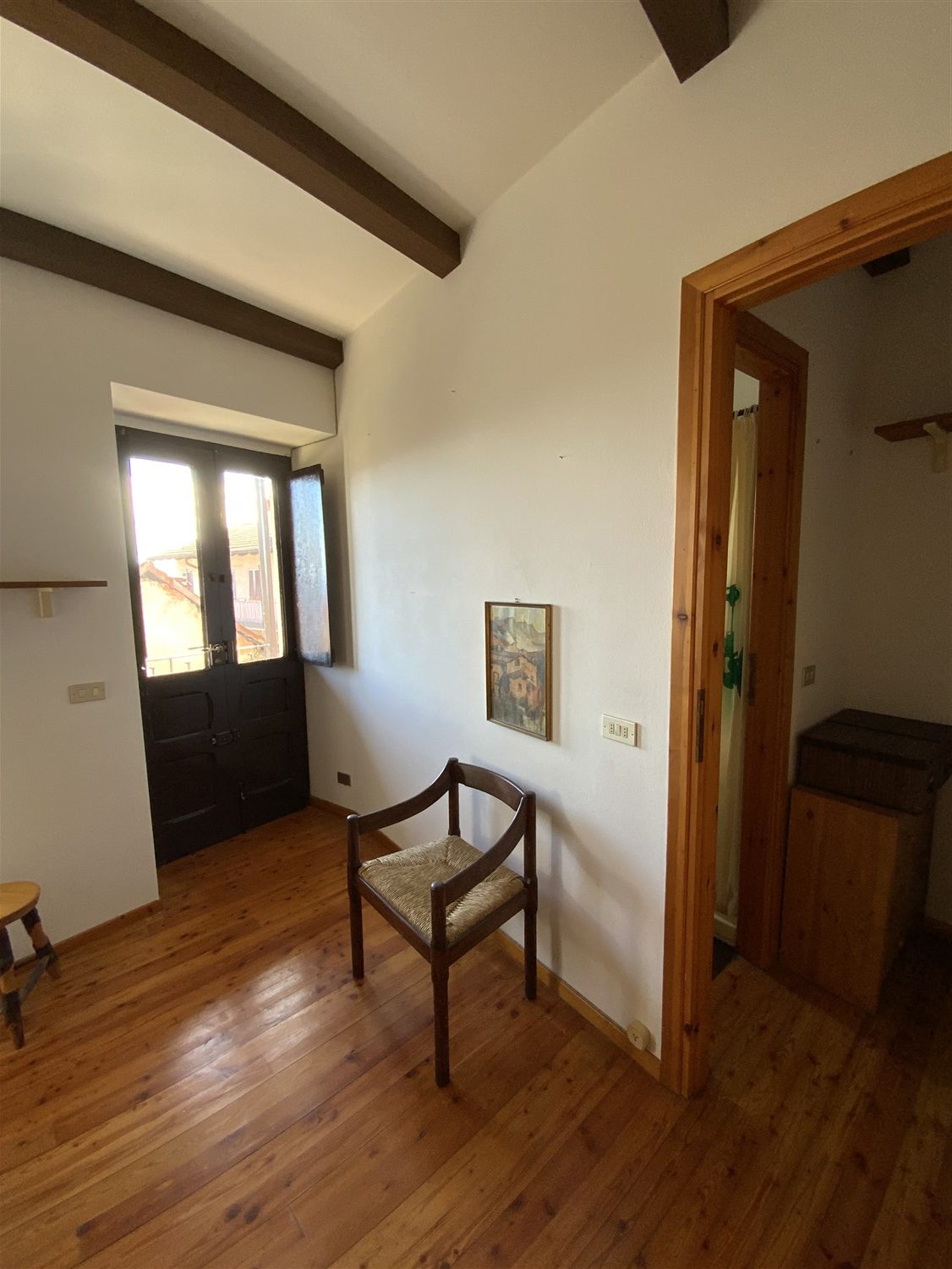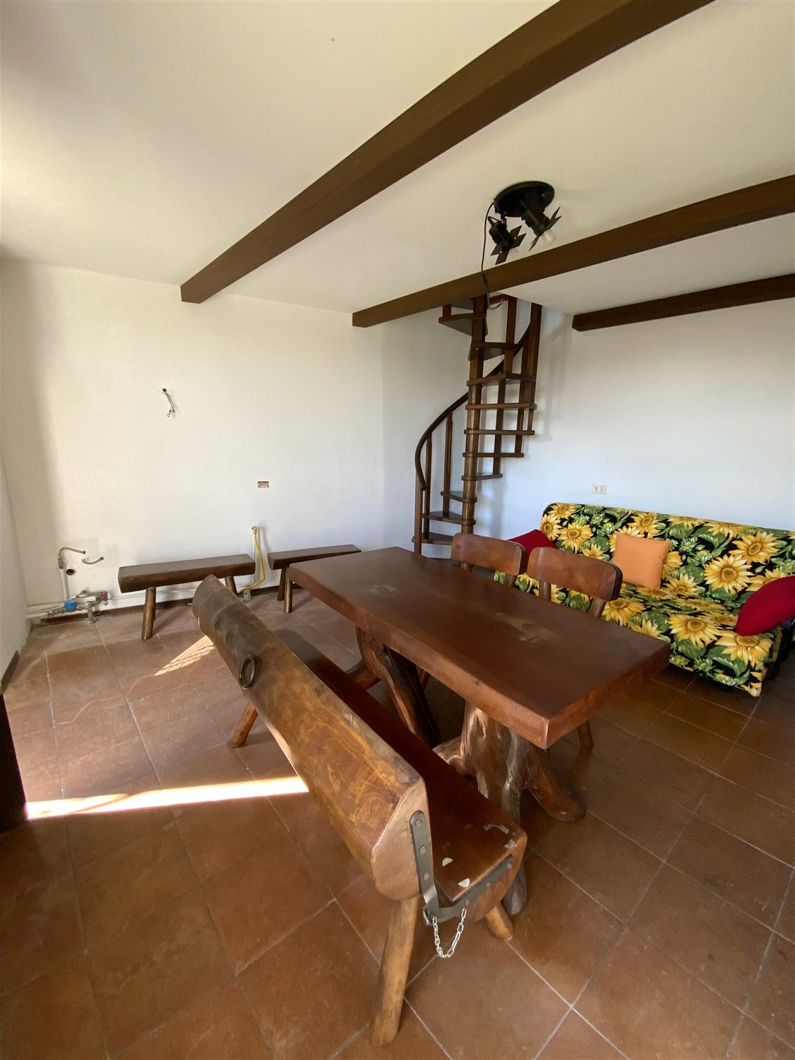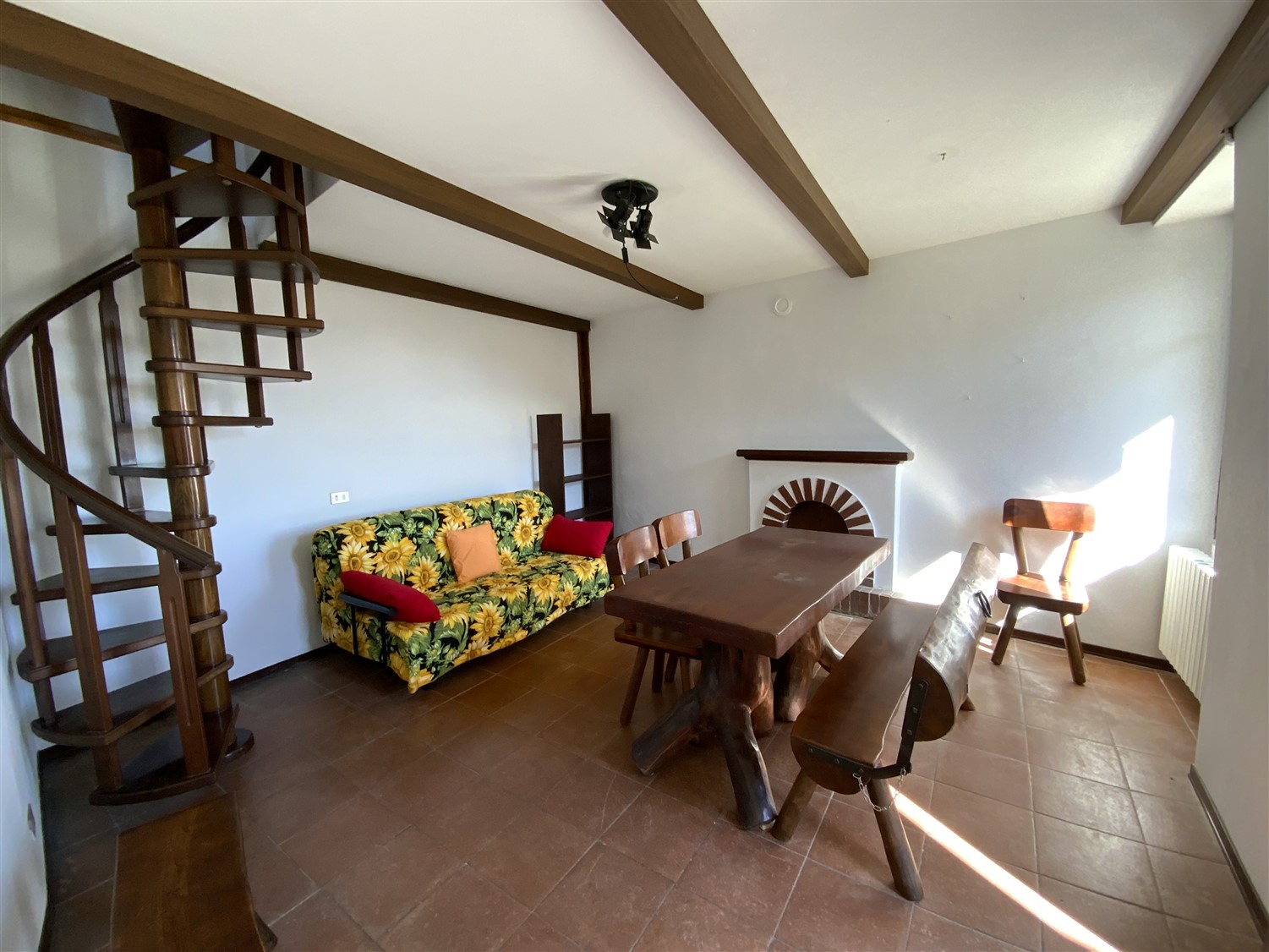 L’appartamento è così disposto: ingresso su soggiorno con angolo cucina e camino a legna, scala che porta al primo piano dove si trova una camera matrimoniale, un e il bagno.