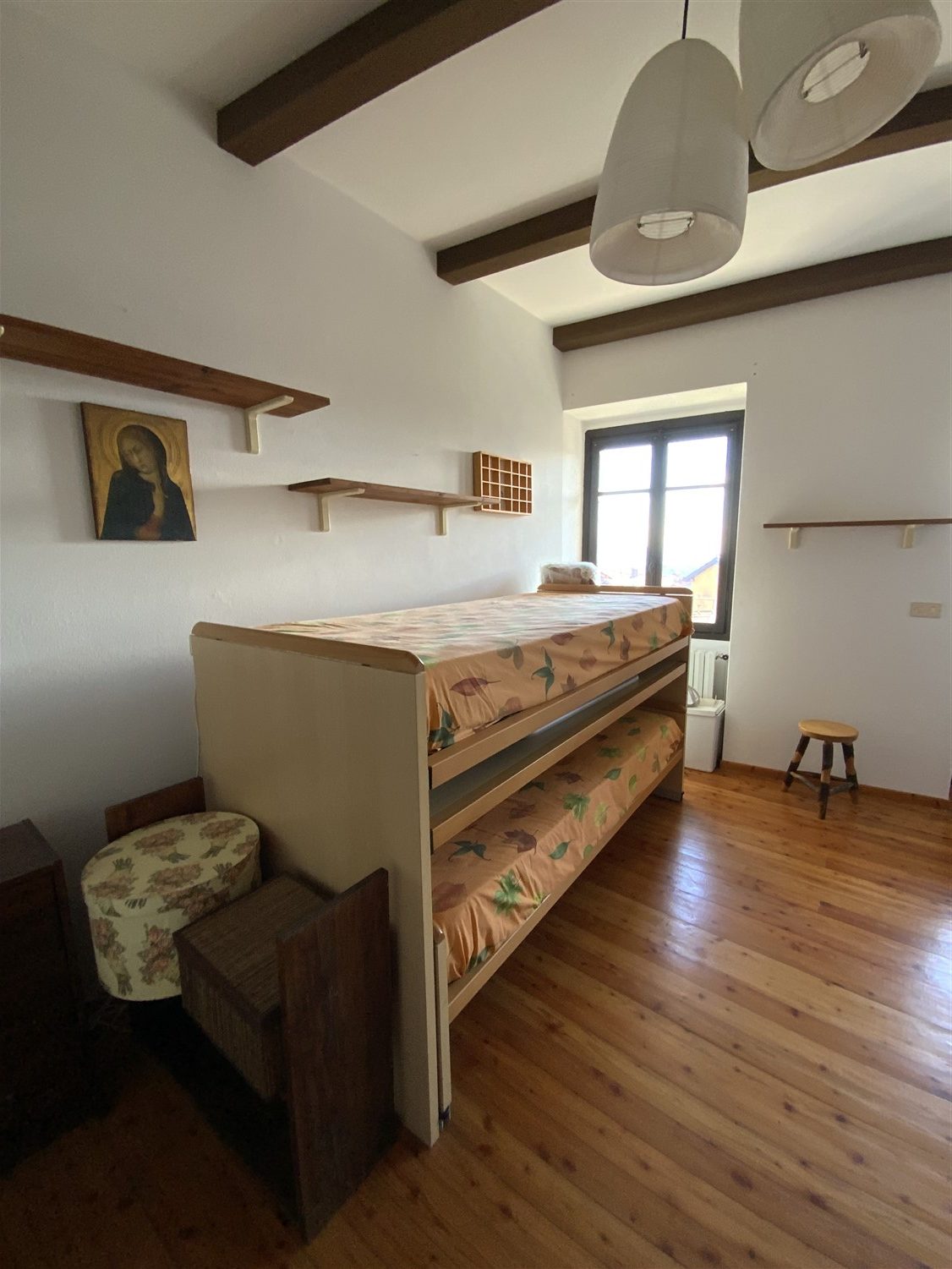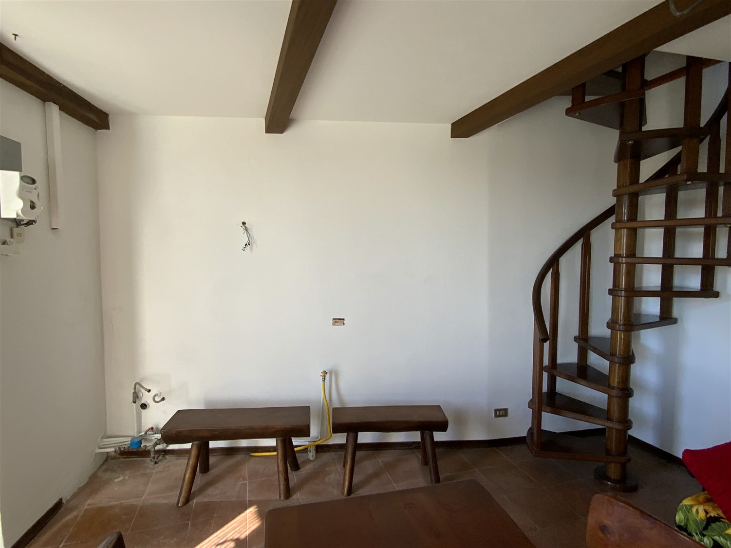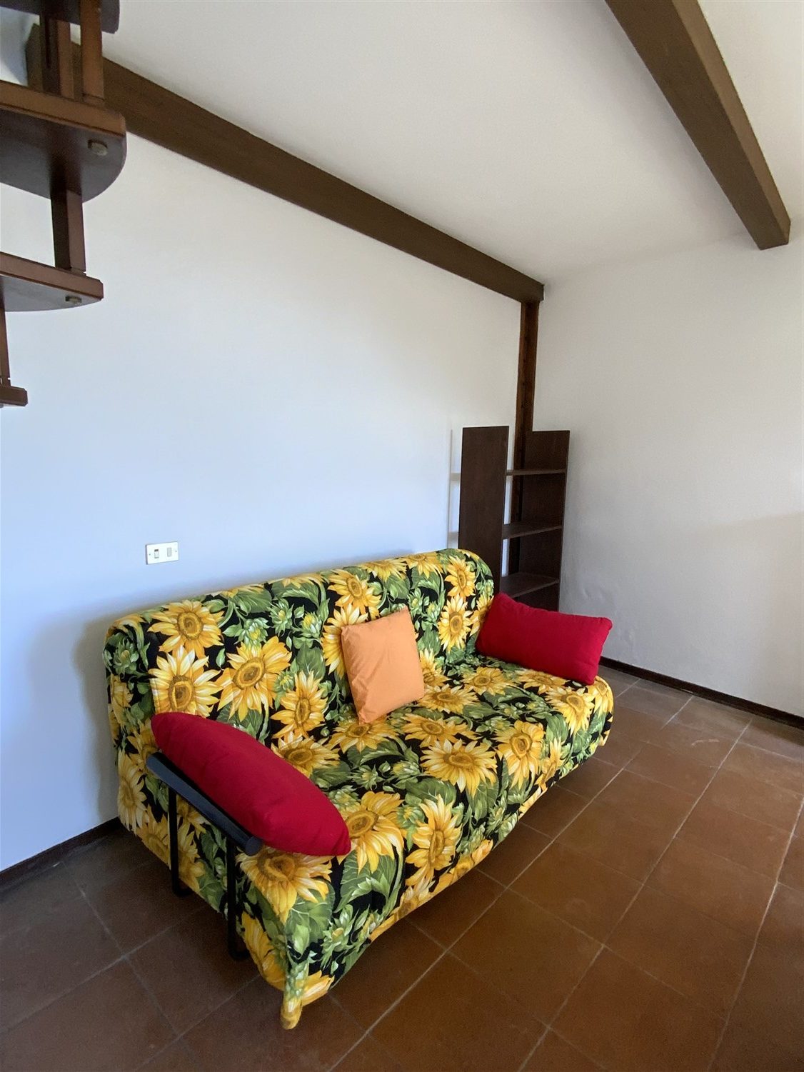 L’appartamento è così disposto: ingresso su soggiorno con angolo cucina e camino a legna, scala che porta al primo piano dove si trova una camera matrimoniale, un e il bagno.