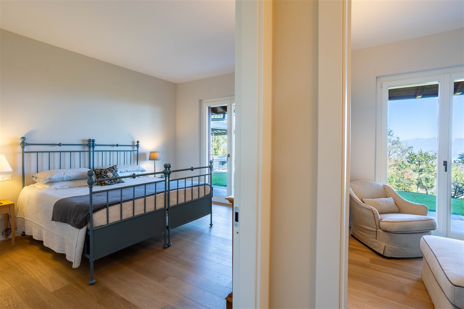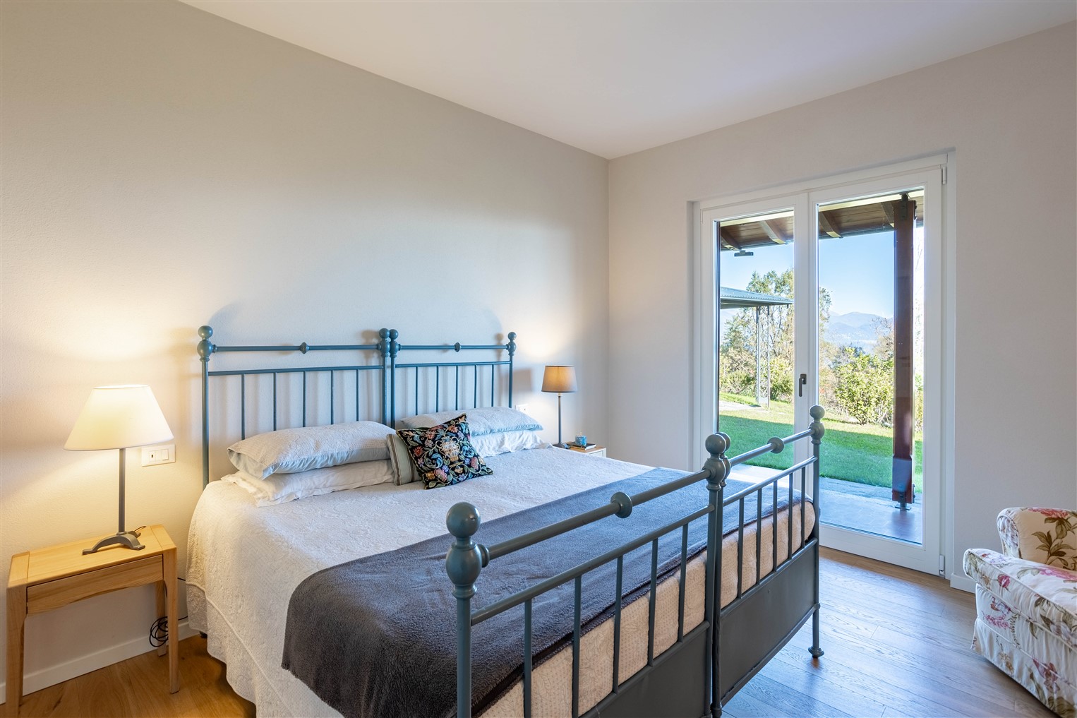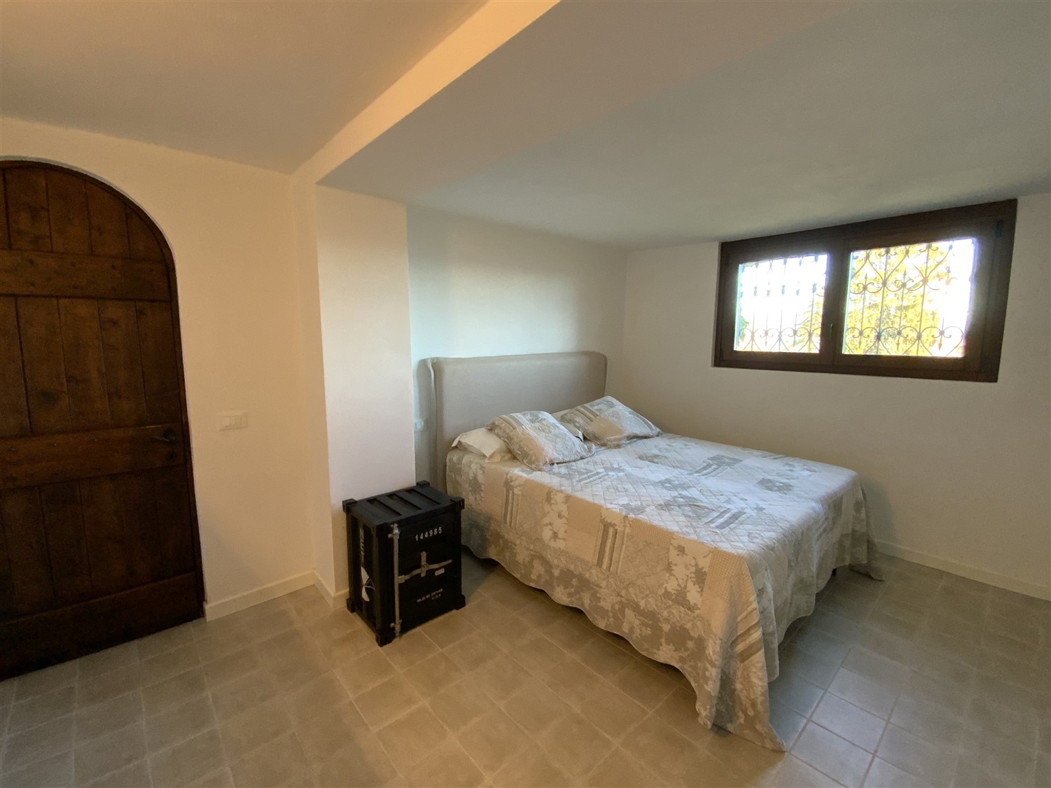 Dalla zona  giorno,  salendo pochi  gradini, percorriamo la zona notte servita da un ampio corridoio completato da un guardaroba, qui si affacciano una camera matrimoniale ospiti, una camera singola, il bagno a servizio, la camera principale ha un suo bagno dedicato.  Tutti i locali giorno/notte hanno accesso al giardino tramite ampie portefinestre che affacciano su comodi porticati.