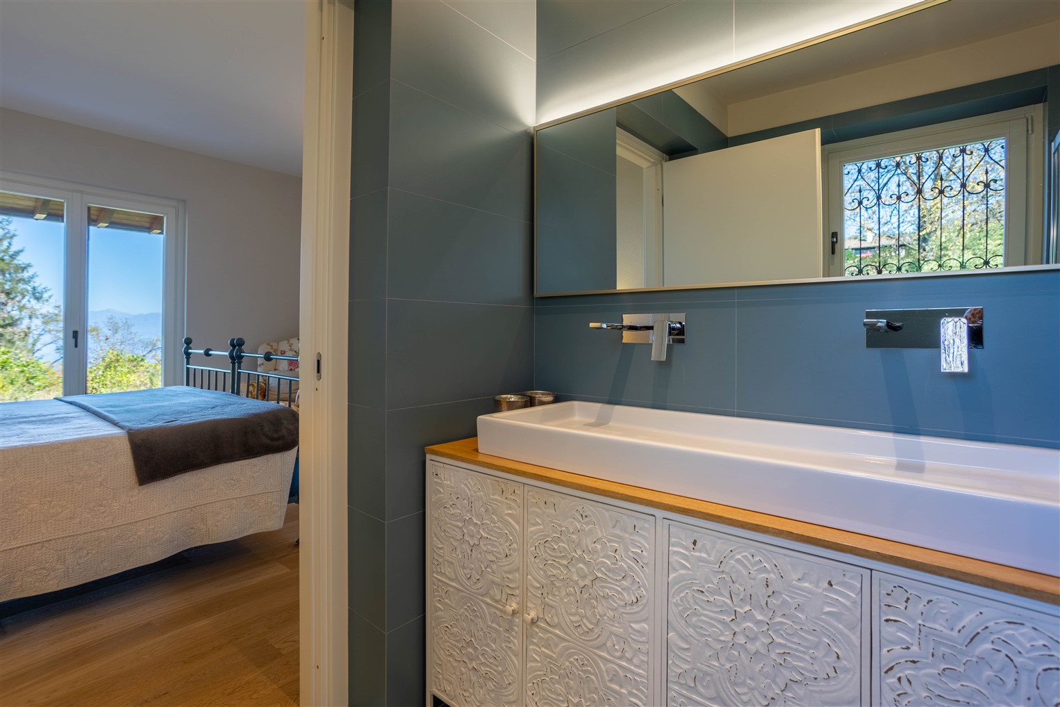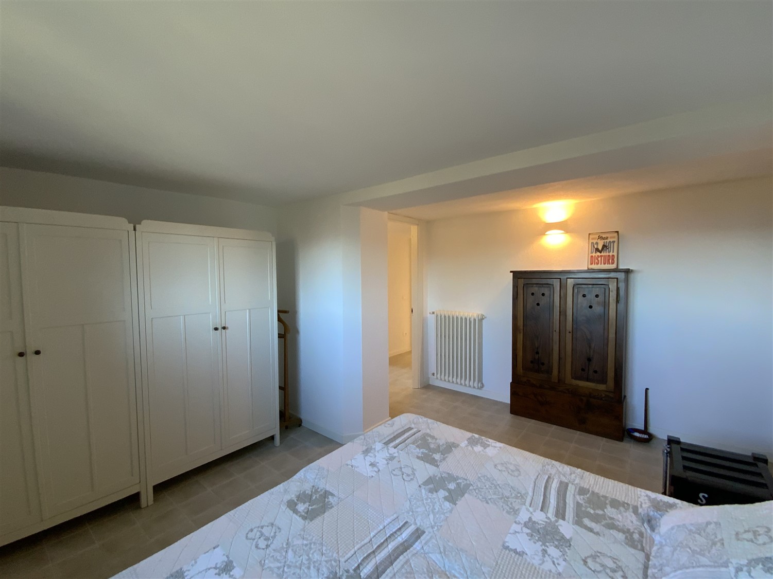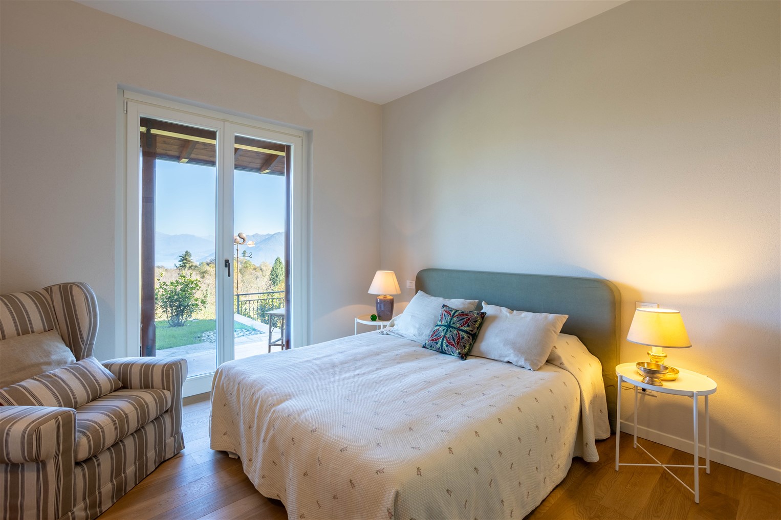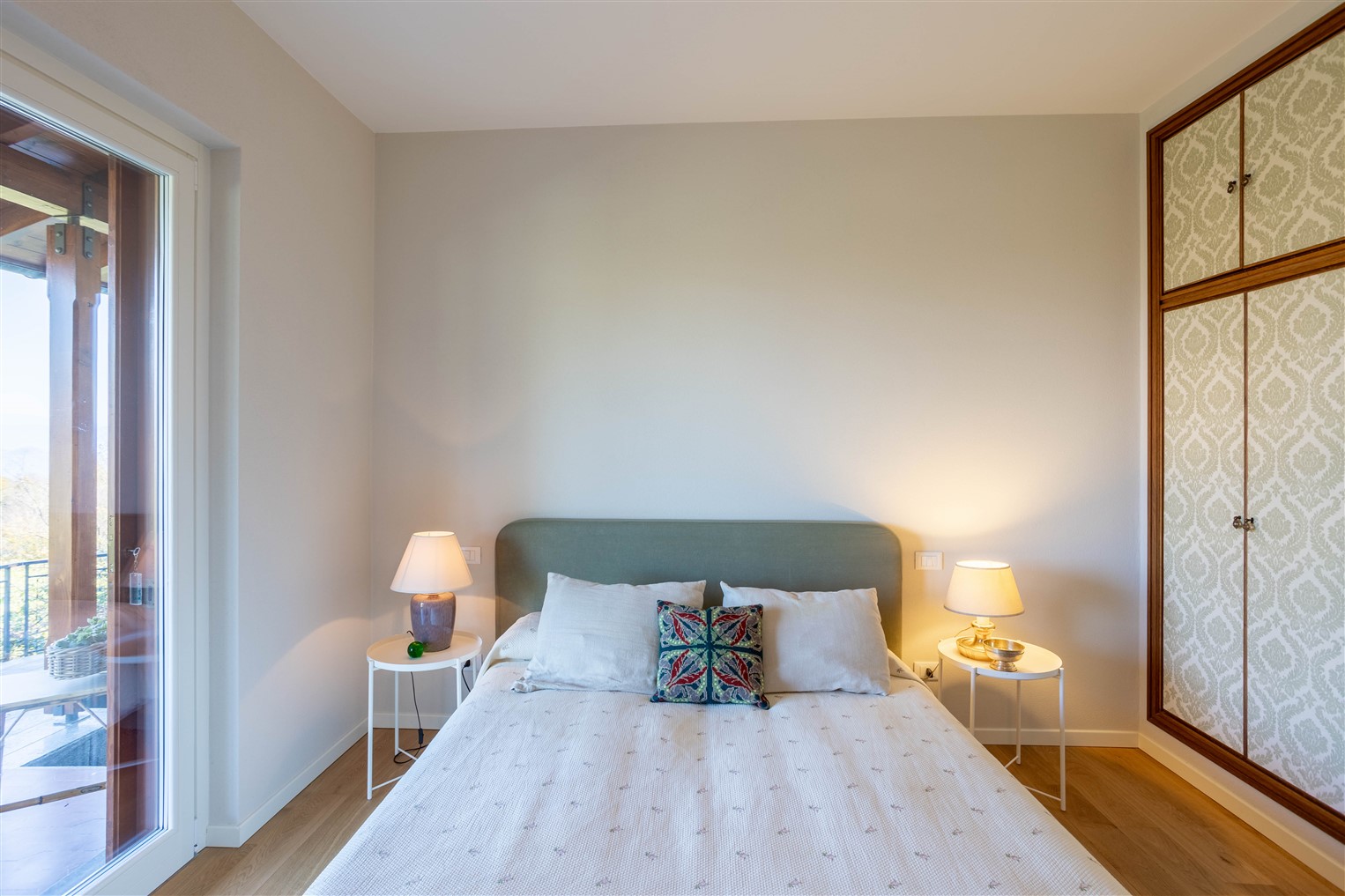 Dalla zona  giorno,  salendo pochi  gradini, percorriamo la zona notte servita da un ampio corridoio completato da un guardaroba, qui si affacciano una camera matrimoniale ospiti, una camera singola, il bagno a servizio, la camera principale ha un suo bagno dedicato.  Tutti i locali giorno/notte hanno accesso al giardino tramite ampie portefinestre che affacciano su comodi porticati.