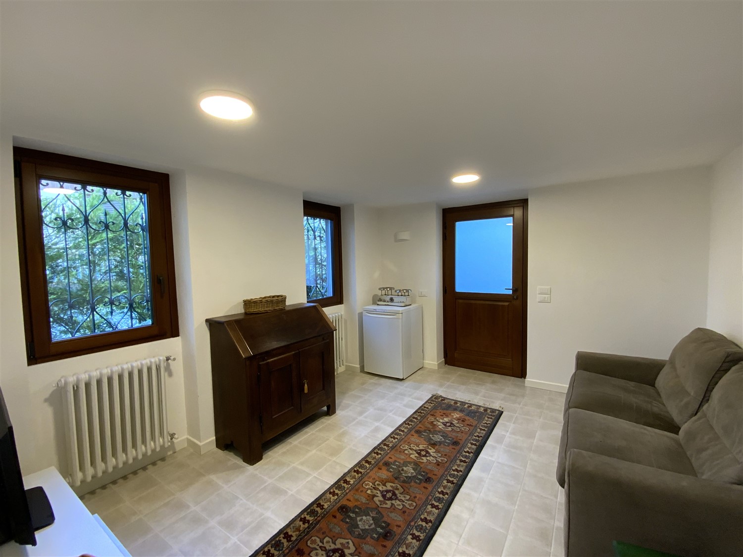 Al piano inferiore, da cui si accede sia dall’interno tramite una comoda scala in legno sia dall’esterno con accesso indipendente, si trova una grande taverna con camino e angolo bar con piccola cantinetta, locale potrebbe divenire una bella sala TV.  Dalla taverna si accede a un piccolo appartamento indipendente con salottino, camera e bagno. Al piano troviamo una  comoda autorimessa.