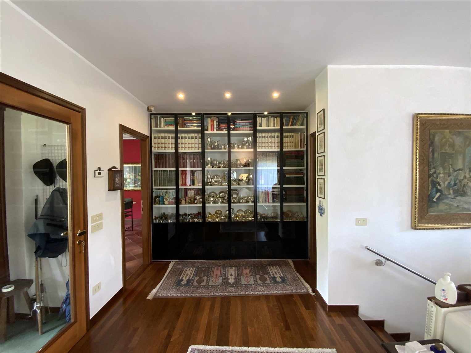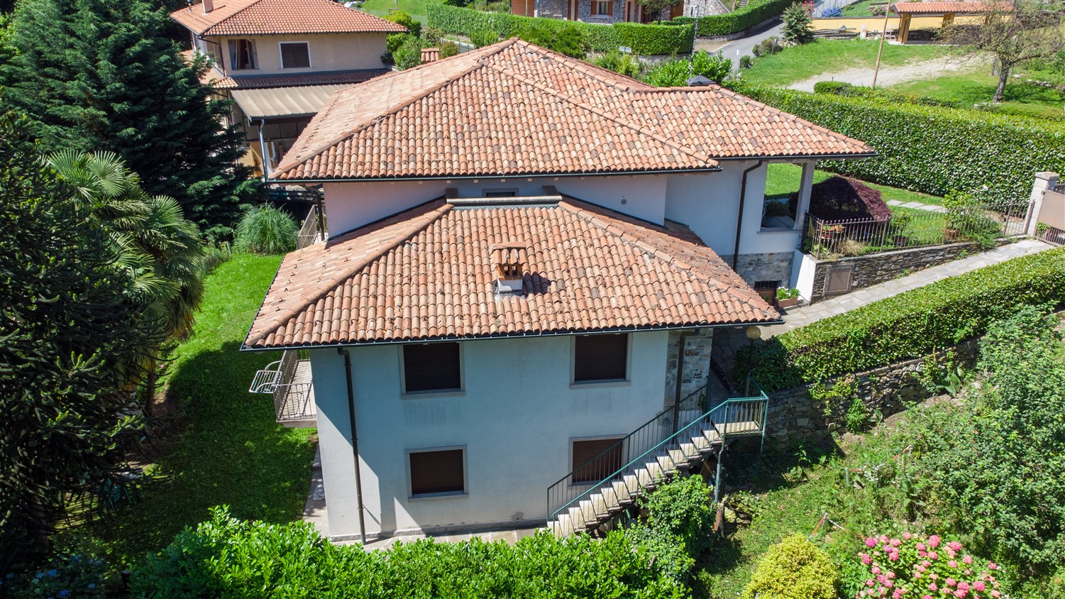 Una ampia scala porta al piano inferiore dove troviamo un’altra zona notte composta da tre camere letto e due bagni, lavanderia cantina e locale caldaia. Anche a questo piano troviamo una terrazza/portico da cui si accede al giardino.