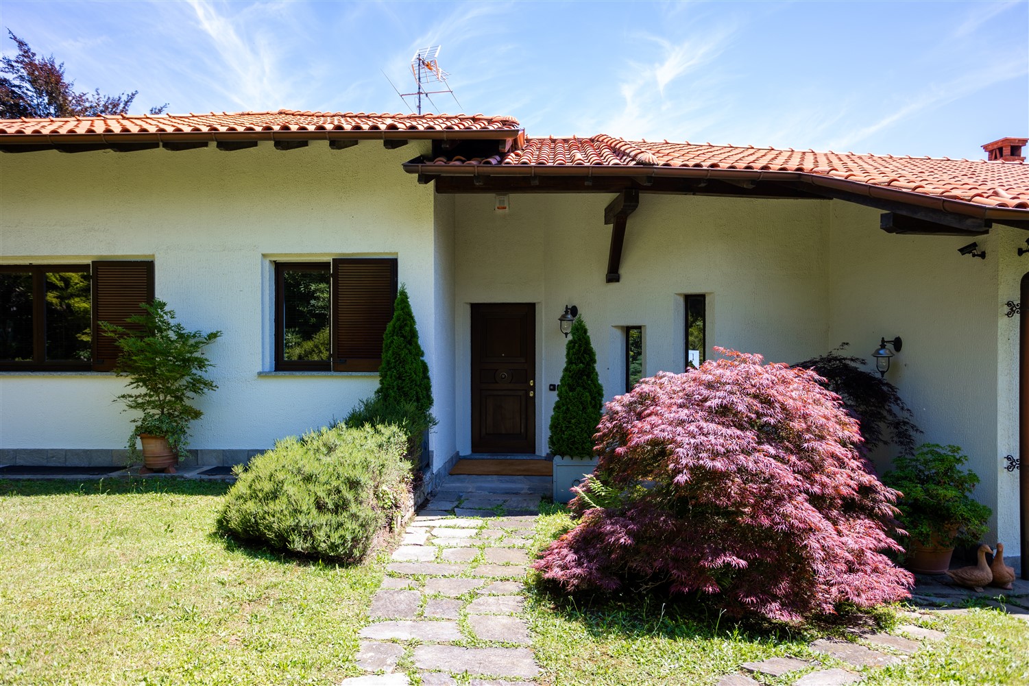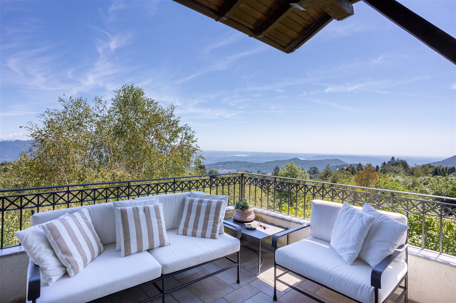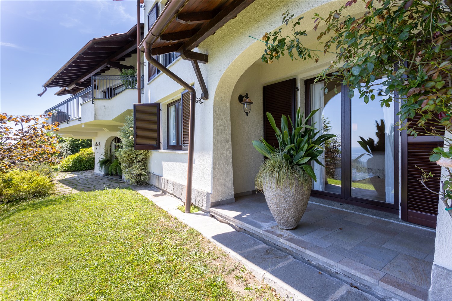 La proprietà oggetto di vendita è completamente indipendente, è in posizione dominante e riservata, ha un gradevole giardino privato posto su due livelli e gode di una panoramica vista sui laghi lombardi e con ampi scorci di lago Maggiore