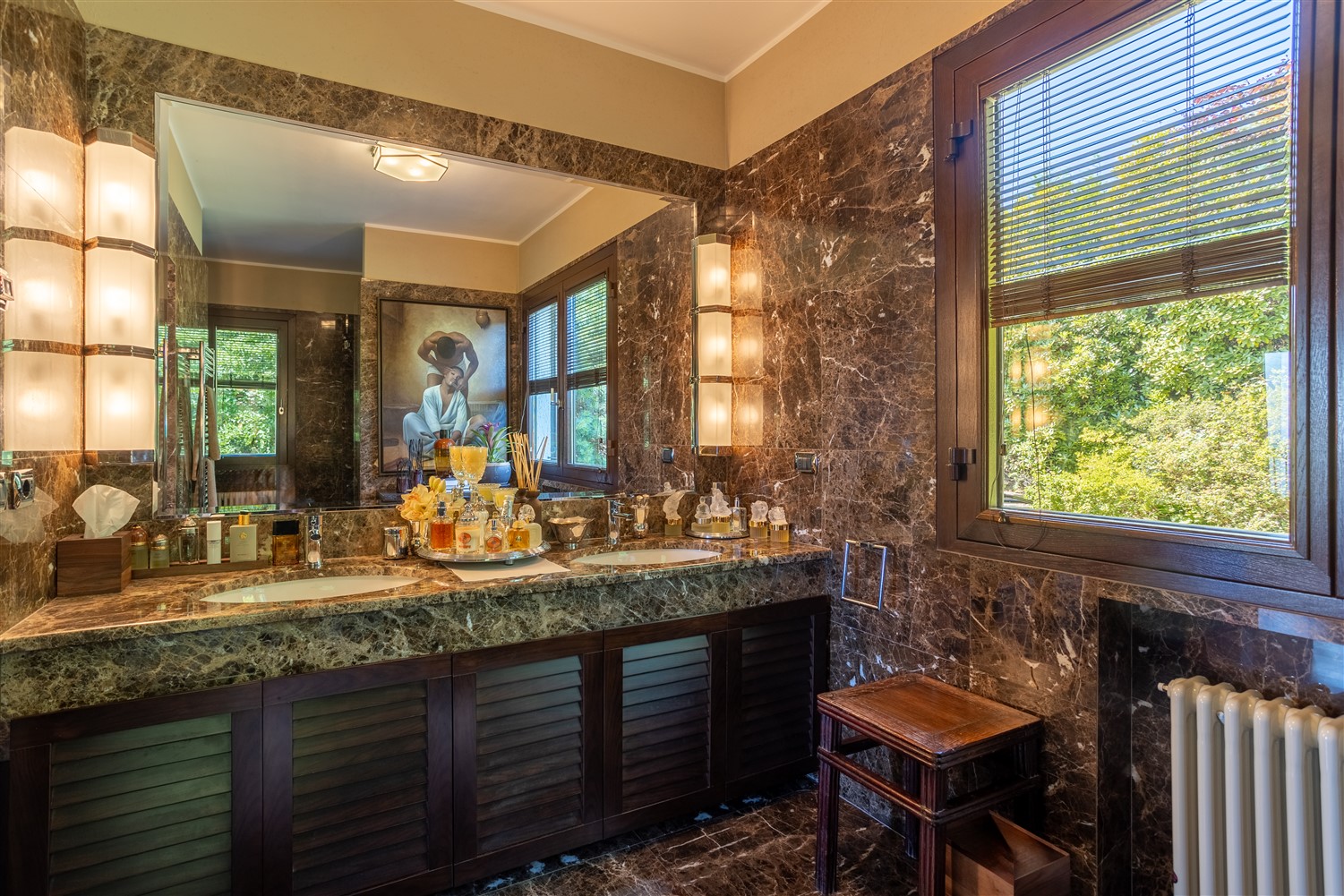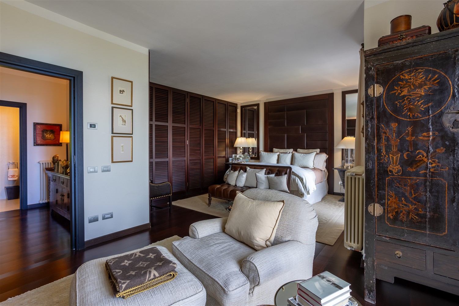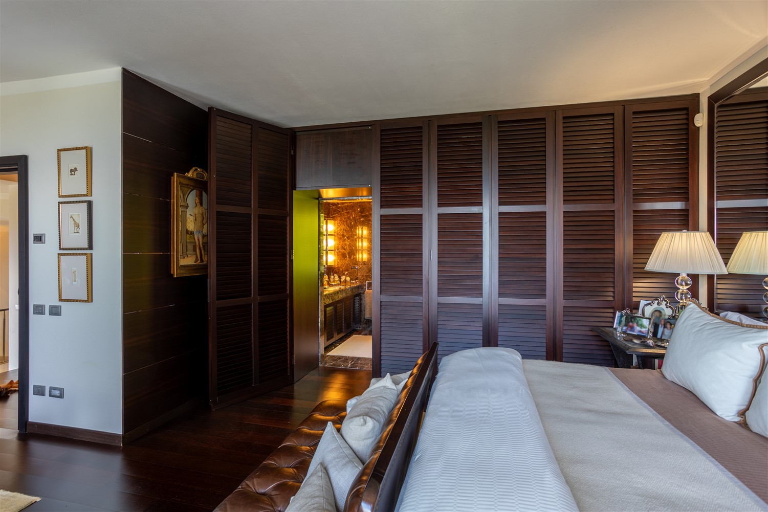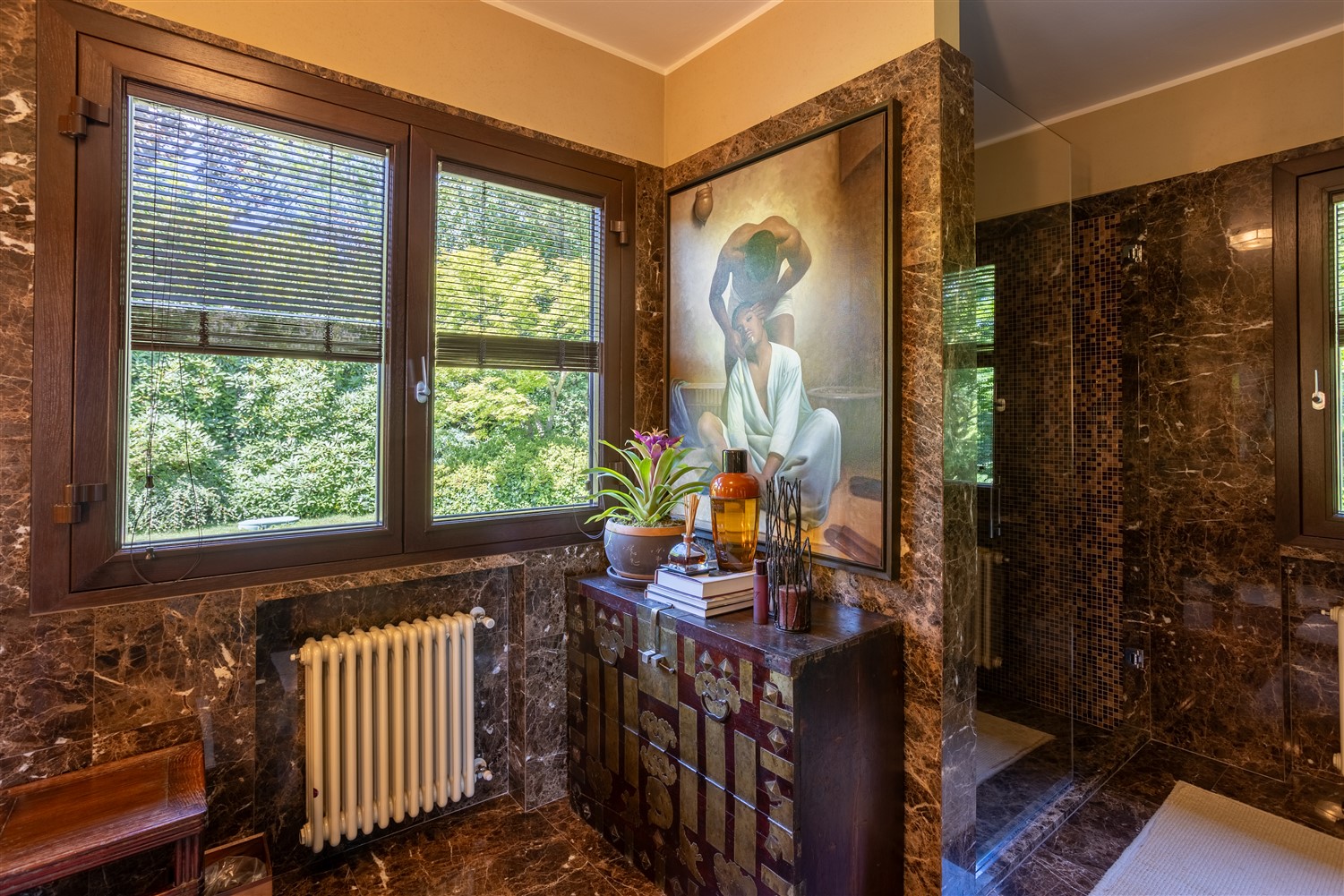 Tornando all’ingresso e salendo tre gradini troviamo il guardaroba e il bagno ospiti, la zona notte padronale, formata da una ampia camera matrimoniale, con angolo salotto studio e un bellissimo bagno en suite in marmo Emperador e mosaico Bisazza.