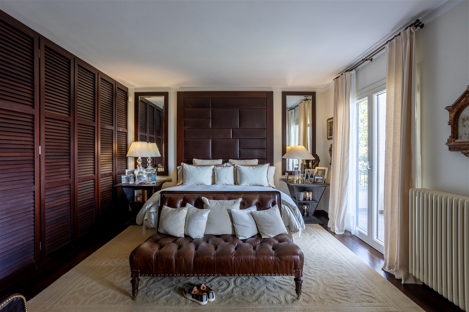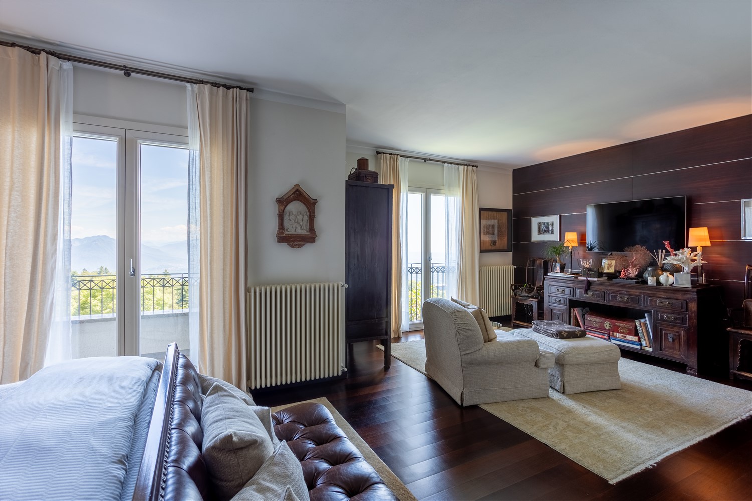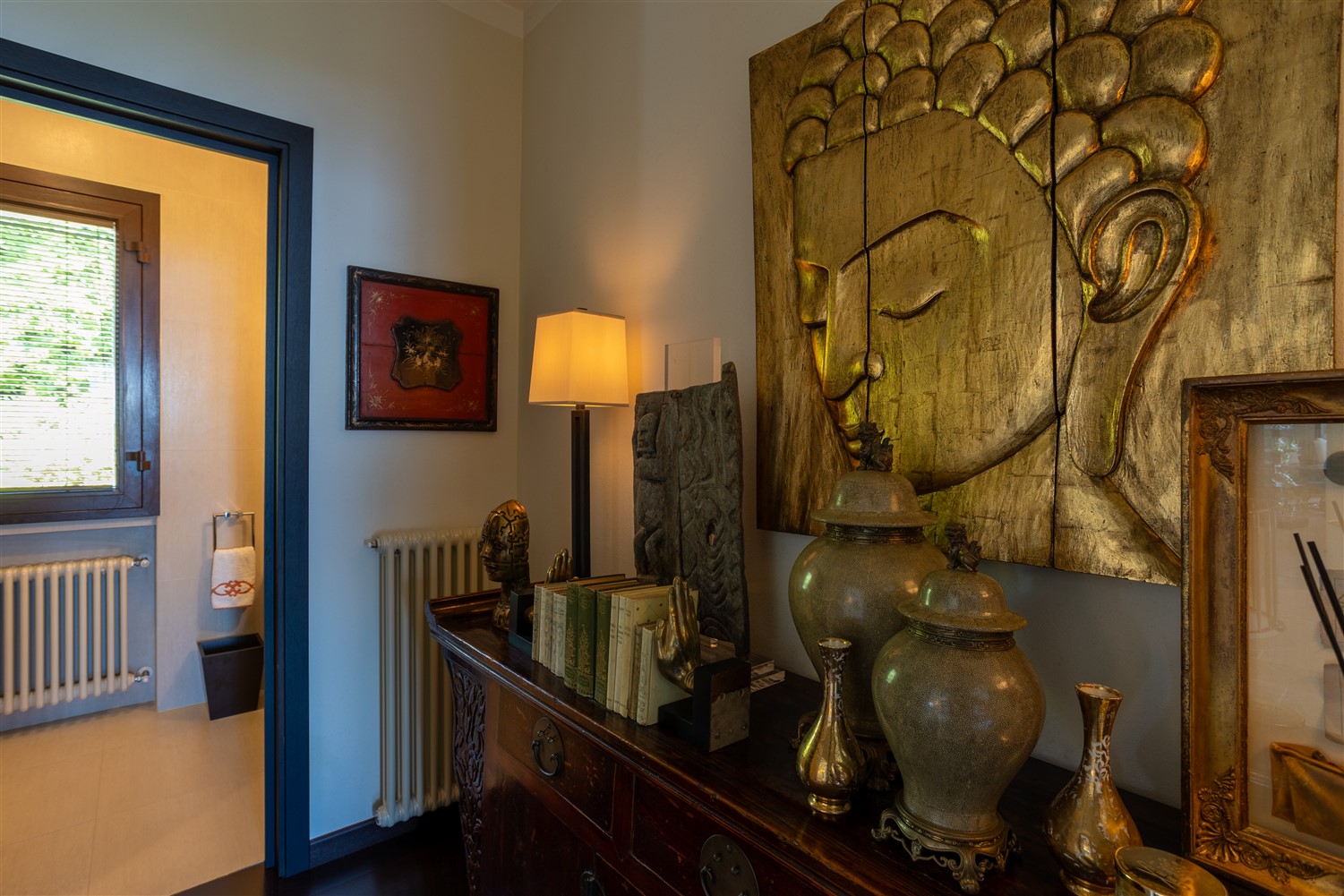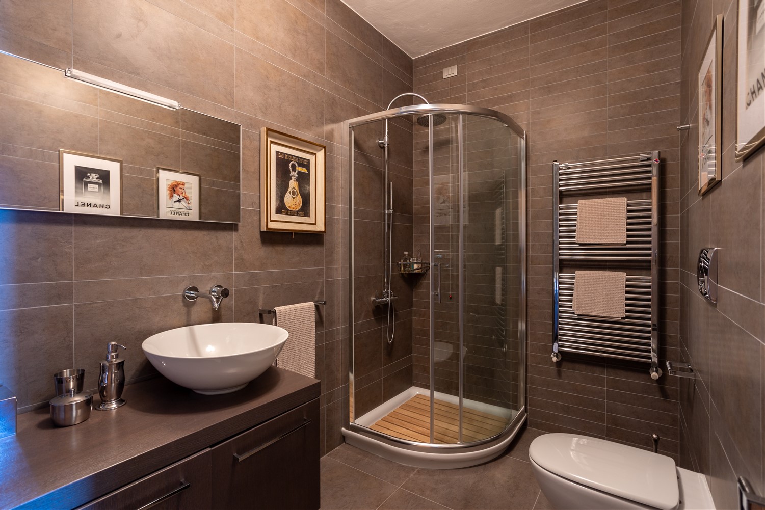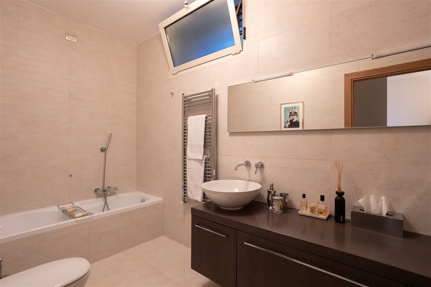 Tornando all’ingresso e salendo tre gradini troviamo il guardaroba e il bagno ospiti, la zona notte padronale, formata da una ampia camera matrimoniale, con angolo salotto studio e un bellissimo bagno en suite in marmo Emperador e mosaico Bisazza.